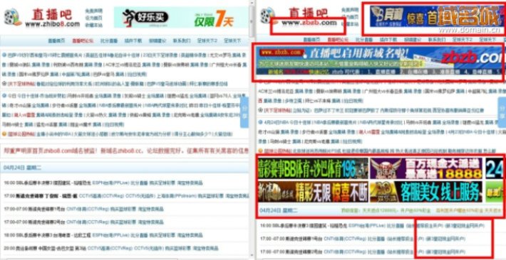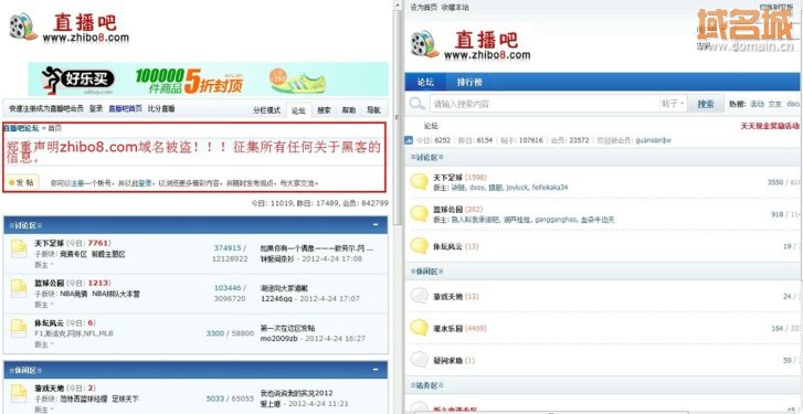 左邊為真直播吧論壇(頁面上刊登了域名zhibo8.com被盜的通告),右邊為假直播吧論壇