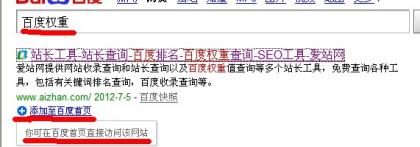 同時,這樣的服務(wù)也有助于百度口碑傳播。因此,無論是“站長工具”,還是“愛站網(wǎng)”,百度搜索結(jié)果當中都出現(xiàn)了“添加至百度首頁”的“不搜即用”提示,這也證明了百度對它們的信任。