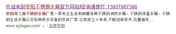 上面圖片顯示的是我的網(wǎng)站的百度快照信息,大標題是“歡迎來到安陽不銹鋼水箱官方網(wǎng)站!咨詢請撥打:.....” 而我的網(wǎng)站代碼中title標簽中的內(nèi)容是: