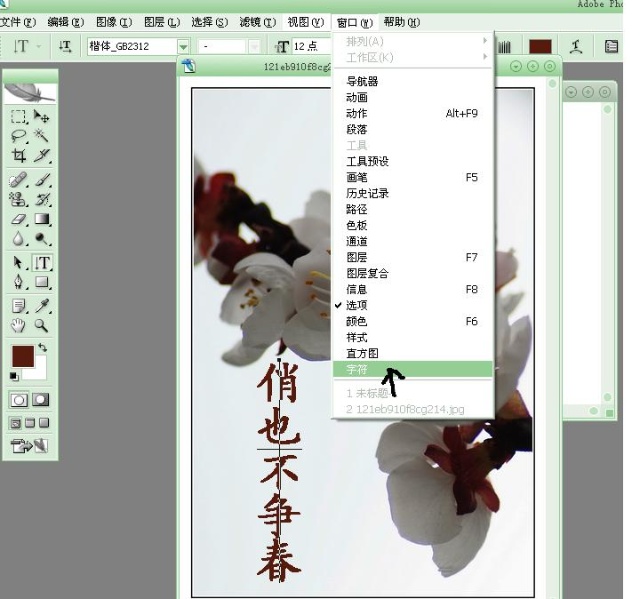 三、開始書寫文字“俏也不爭春”,然后點擊“字符”。
