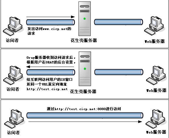 當(dāng)我們?yōu)橛蛎皐ww.cicp.net”設(shè)置了轉(zhuǎn)發(fā)的URL為 “http://test.cicp.net:8080”后,互聯(lián)網(wǎng)用戶訪問www.cicp.net域名的時(shí)候,Oray服務(wù)器會(huì)自動(dòng)檢測(cè)該域名是否設(shè)置了URL轉(zhuǎn)發(fā)。如果是,則告訴該域名真正的地址給訪問者。最后,訪問者直接通過真正的地址http://test.oray.net:8080來訪問Web服務(wù)器。整個(gè)過程如下面的示意圖所示。